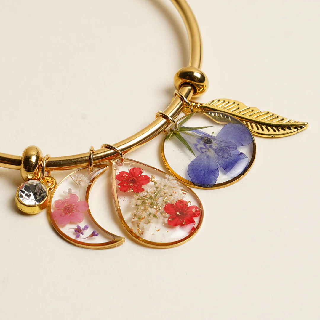Created with demi-fine, high-quality materials, this heirloom-worthy piece features artisan resin charms, each thoughtfully composed with preserved botanicals, framed in radiant gold, and accented by meaning.